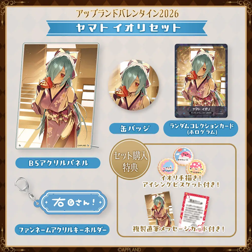 セット内容:B5アクリルパネル、缶バッジ、ホログラムコレクションカード、ファンネームアクリルキーホルダー(アクリル/約30×80mm内)