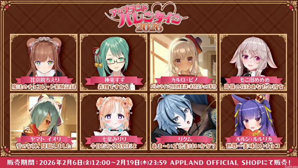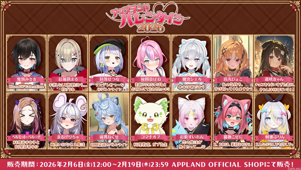 株式会社アップランド(本社:東京都世田谷区)は、運営する「.LIVE」・「ぶいぱい」の所属メンバーが参加する『アップランドバレンタイン2026』グッズ&ボイスを、APPLAND OFFICIAL SHOPにて2026年2月6日(金)より販売開始することを発表しました。