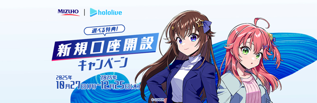株式会社みずほ銀行(頭取:加藤勝彦、以下「みずほ銀行」)は、ホロライブプロダクション所属の人気VTuber「ときのそら」「さくらみこ」(以下「そらみこ」)とコラボレーションをした、「ホロライブコラボ新規口座開設キャンペーン」を2025年10月27日(月)から12月25日(木)の期間で開催することを明らかにしました。