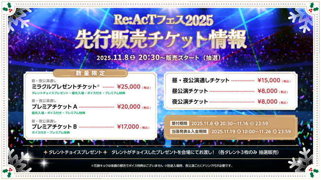 株式会社mikai(代表取締役:上村 隆博)は、運営するVTuber事務所「Re:AcT」の所属メンバー全員が出演するクリスマスライブを2025年12月21日(日)に池袋harevutaiにて開催することを発表。これに伴い、チケット先行抽選販売を11月8日(土)より開始しています。