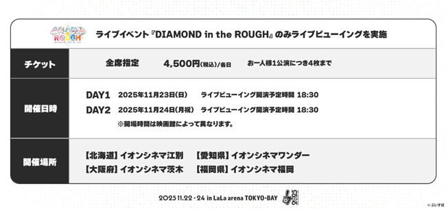 株式会社バーチャルエンターテイメントが運営する次世代 Virtual esports Project「ぶいすぽっ!」は、2025年11⽉22⽇(⼟)‧23⽇(⽇)‧24⽇(⽉祝)の3⽇間でLaLa arena TOKYO-BAYにて開催予定の全体フェス『ぶいすぽっ!フェス 2025』の現地チケットを、2025年10⽉18⽇(⼟)AM10時より先着順にて⼀般発売を開始することを発表。また、11⽉23⽇(⽇)‧24⽇(⽉祝)に開催されるライブイベント「DIAMOND in the ROUGH」のライブビューイングを全国4都市(北海道‧愛知県‧⼤阪府‧福岡県)にて実施することを明らかにしました。