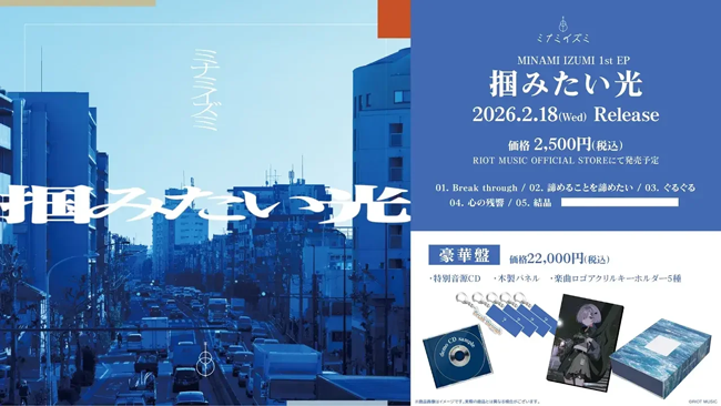 株式会社RIOT MUSIC(本社:東京都港区、代表取締役:舩橋 純、読み:ライオットミュージック、以下「RIOT MUSIC」)は、運営するVSingerレーベル「無原唱レコード」に所属するシンガーソングライター「ミナミイズミ」の1st EP『掴みたい光』を、2026年2月18日(水)にリリースしたことを発表。これにあわせて、YouTubeチャンネルにて全楽曲を試聴できるクロスフェード動画が公開されました。
