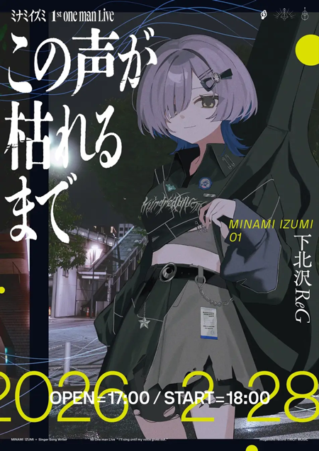また、同年2月28日(土)には『ミナミイズミ 1st ONE MAN Live “この声が枯れるまで”』が下北沢ReGにて開催予定です。