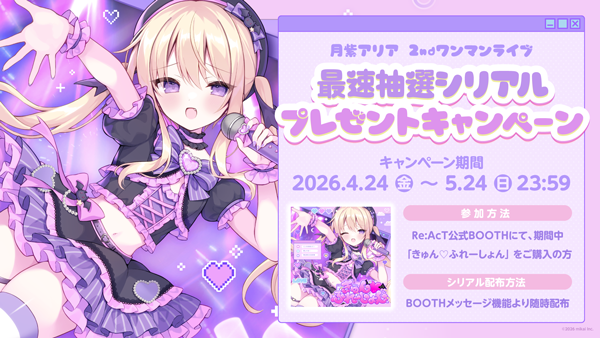 株式会社mikaiが運営するVTuber事務所「Re:AcT」は、所属する「月紫アリア」による2ndワンマンライブを2026年8月29日(土)GRIT渋谷にて開催することを発表。これに併せて、ワンマンライブの先行抽選のシリアルが付くニューシングル『きゅん♡ふれーしょん』が本日4月24日(金)にリリースしました。